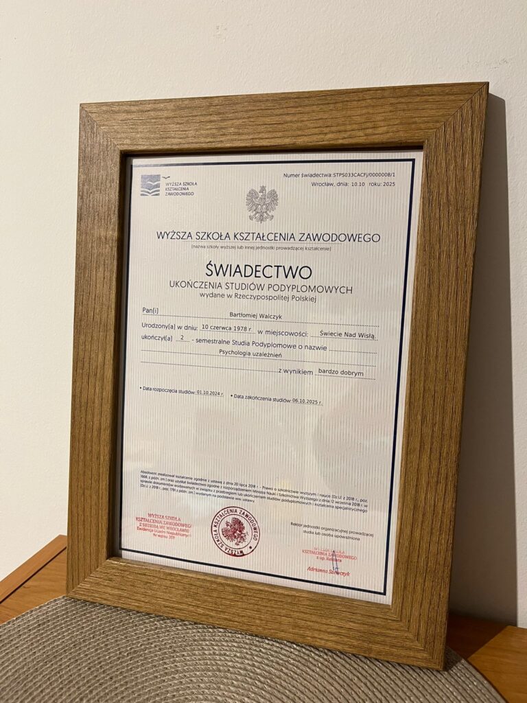 Rozumiem te doświadczenia, ponieważ sam przeszedłem własną drogę przez uzależnienie – mogę więc połączyć wiedzę akademicką z osobistym doświadczeniem, oferując wsparcie pełne empatii i skuteczności. Dziś wspieram ludzi w odkrywaniu ich własnej drogi ku wolności od uzależnień. Spotykam się z człowiekiem - nie z diagnozą - w przestrzeni szczerości, uważności i pełnego szacunku.
